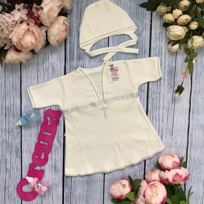 Теги: Купить оптом крестильную рубашку. 169. Крестильная рубашка с чепчиком (серебро), хлопок 100 % интерлок 62,68,74,80 цена,отзывы официальный сайт "Стеша Иваново"
